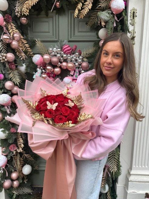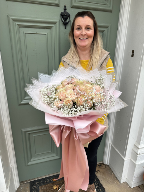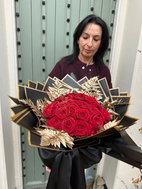 -A 25 stem rose bouquet with luxury wrapping and a large satin bow