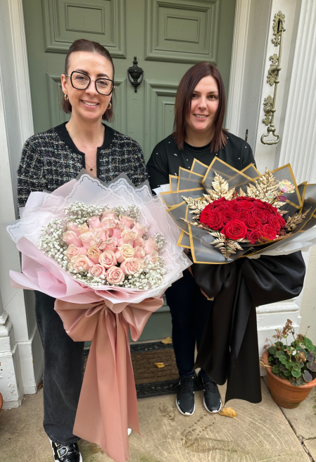 A 25 stem rose bouquet with luxury wrapping, a large satin bow and displayed in a floristry box. We then add extras of your choice- butterflies, glitter, iridescent rose, bows, diamontes etc.