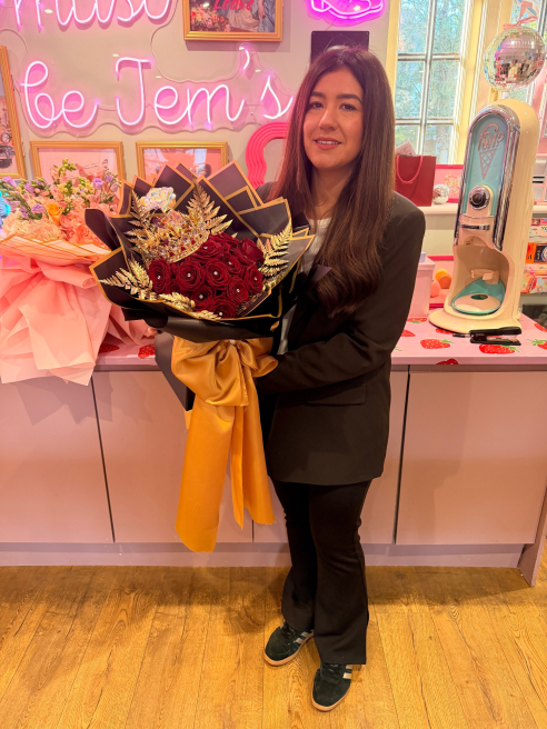 A 25 stem rose bouquet with luxury wrapping, a large satin bow and displayed in a floristry box. We then add extras of your choice- butterflies, glitter, iridescent rose, bows, diamontes etc.