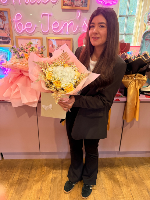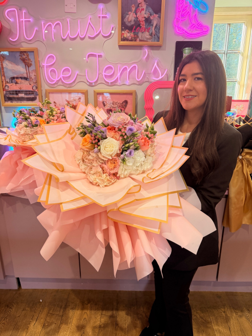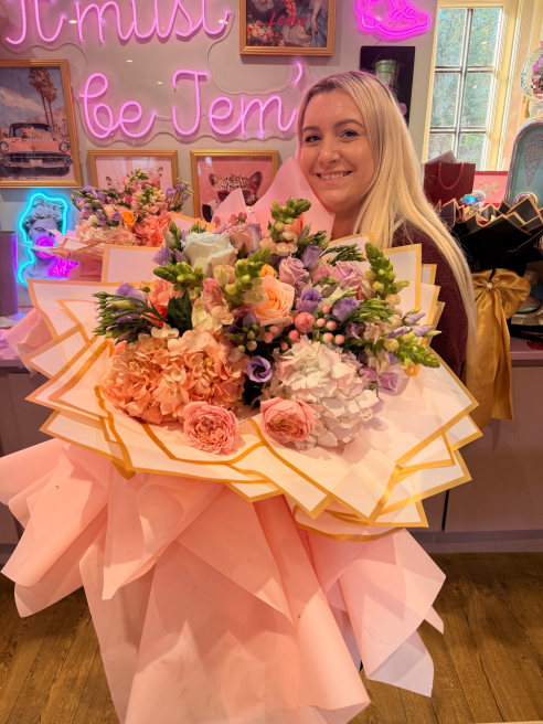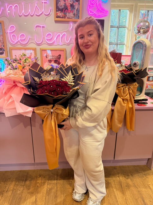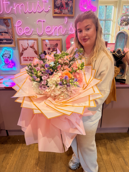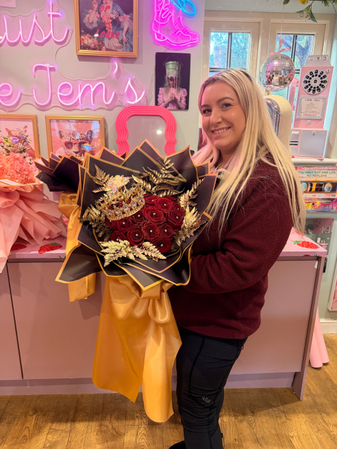 A GIANT bouquet! Learn from the OG!! Bigger is better here at Jem’s. We will make this bouquet EXTRA!! We use various flower types that are available all year round so your customers will not be disappointed! We learn my viral skirt wrapping and add a crown if you wish.