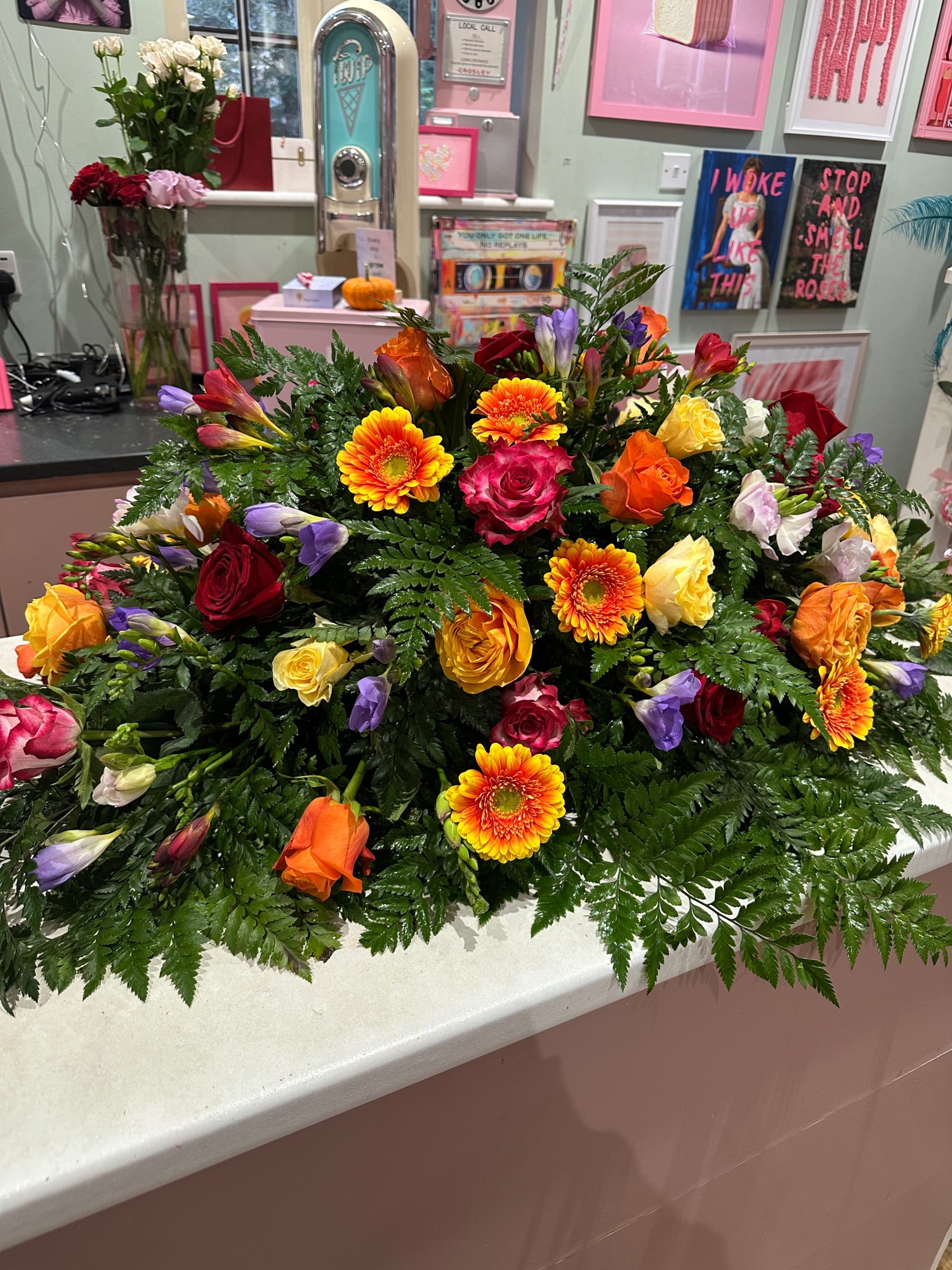 With the process, we will discuss favourite colours and flowers, even if it’s something out the ordinary, it doesn’t matter, I can do this for you. I have had many unusual requests. After we have agreed on the tributes, you can leave with the peace of mind that they will be perfect on the day. Payment just needs to be made 3 days before the day. I can send pictures throughout as well. Also I’m just on the end of the phone for any updates or alterations. I try to make you see me more as a friends than a Florist.